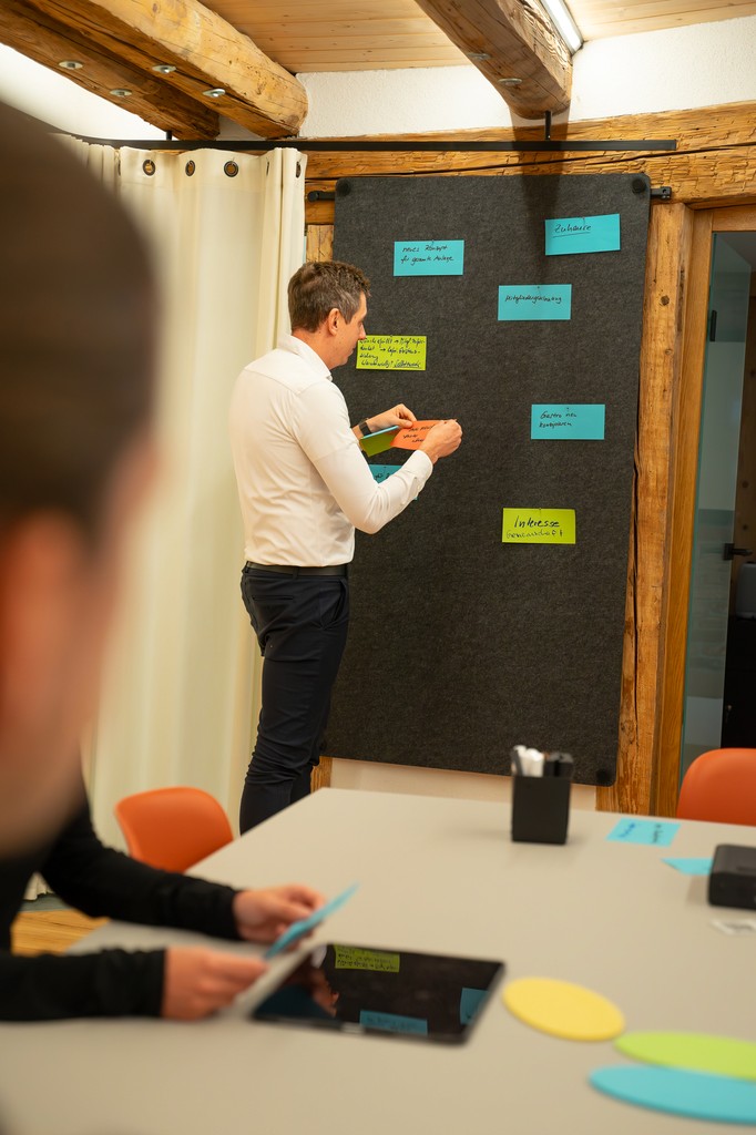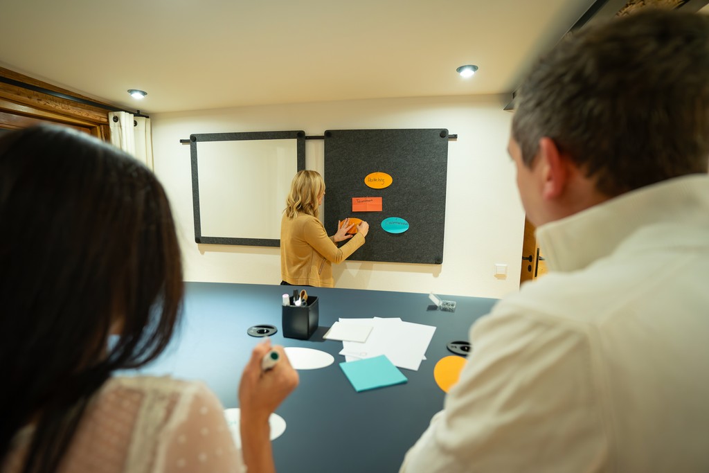 Die Aufgabe für die Gruppen können in unterschiedlichen Räumen des Hauses bearbeitet werden. Die analogen Whiteboards und Pinnwände eigenen sich dafür die Ergebnisse der Gruppenarbeit festzuhalten. Dies kann auch digital auf dem Laptop oder Tablet passieren.